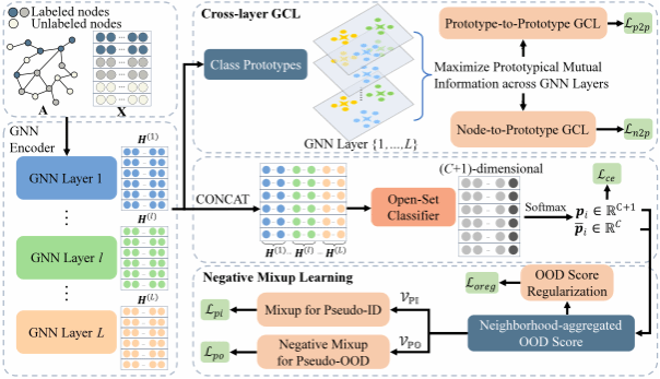 该论文题目为“negMIX: Negative Mixup for OOD Generalization in Open-Set Node Classification”。该论文针对开放集节点分类(Open-set Node Classification) 问题,提出负向混合跨层图对比学习(Negative Mixup with Cross-Layer Graph Contrastive Learning, negMIX)方法。